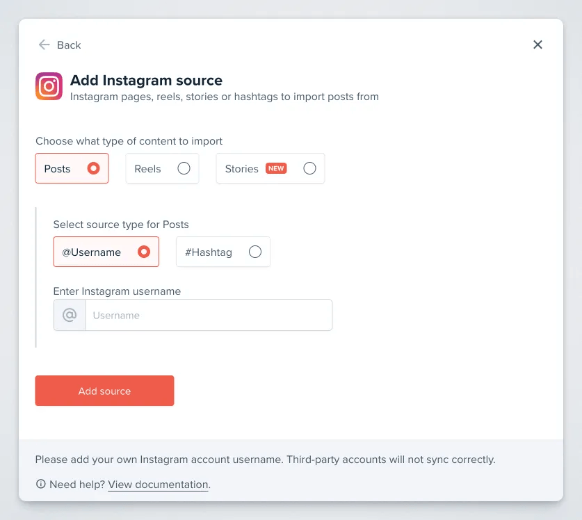 👉 If you want to add an Instagram Hashtag source, please refer to the How to add an Instagram hashtag source to Juicer help doc.👉 If you would like to add an Instagram Reels source, please refer to the Instagram Reels are not showing up in my feed help doc.