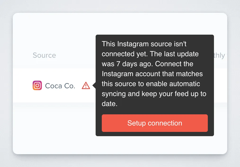 ”This Instagram source isn't connected yet. The last update was X days ago. Connect the Instagram account that matches this source to enable automatic syncing and keep your feed up to date.”